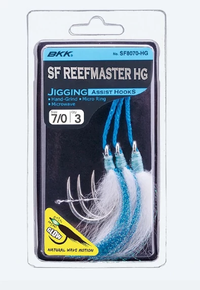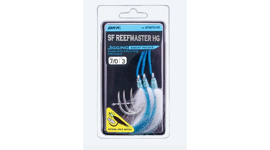 A BKK SF Reef Master HG segédhorog egy sokoldalú jighorog, amelyet gyors jiggeléshez fejlesztettek ki. A segédhorog kiváló minőségű természetes szőrrel van előre megkötve, amely jelentősen javítja a jig vízben való felkínálását. Még akkor is, ha a halak inaktívak, ez a tollas horog, amely izzó szállal van felszerelve, stimulálja őket, ami további csapásokat eredményez. A segédhoroghoz használt fonott zsinór puha és egyben rendkívül erős.