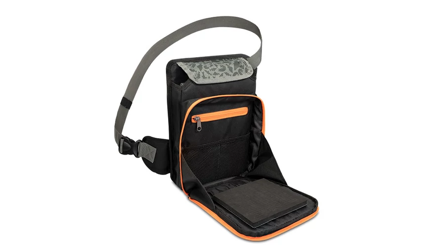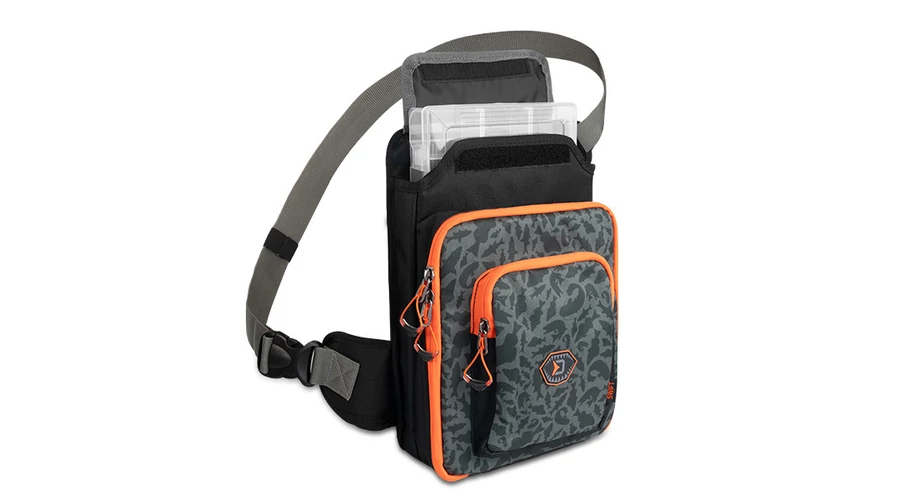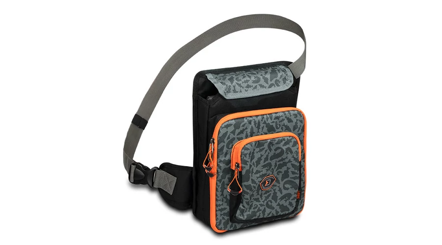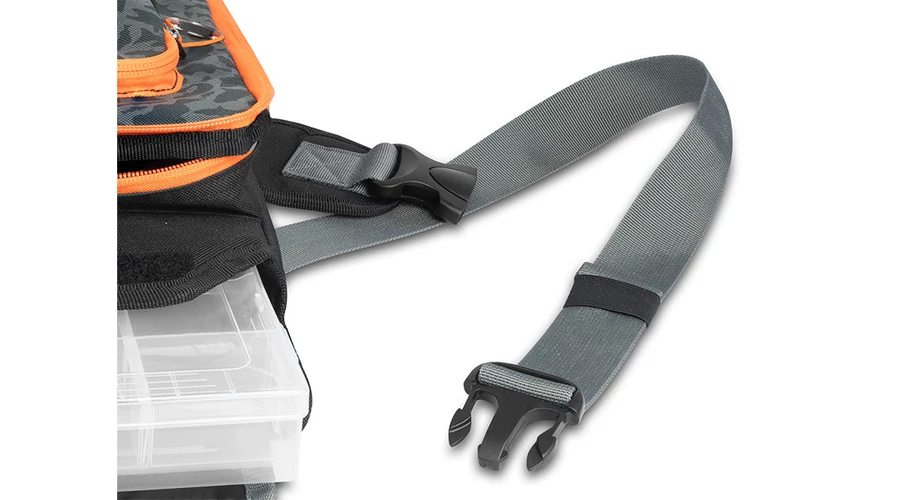 Ezt a crossbody táskát a mellkasára helyezheti, hogy könnyen hozzáférjen a csalikhoz és a tartozékokhoz anélkül, hogy folyamatosan le kellene vennie a válláról. Így több időt és energiát takaríthat meg a horgászathoz. Egy tépőzárral gyorsan elérhető a táska fő rekesze, amiben egy műanyag tárolódoboz található kivehető elválasztókkal a csalik számára. Egy kisebb cipzáras zsebben egy EVA hab tároló is található, ami bevágásokkal rendelkezik a használatra kész csalik tárolására. Tépőzárral van rögzítve, ami azt jelenti, hogy levehető vagy kicserélhető. A zseb elég szélesre nyitható a kényelmes használathoz, és annak mindkét oldalán a varrott anyag megakadályozza, hogy a csalik kiessenek, ha esetleg nincsenek megfelelően rögzítve. Belül két kisebb hálós zseb és egy kis cipzáras zseb található az apró kiegészítők számára. A táska alsó részén egy mágnes található, amely minden tárgyat a helyén tart. A táska tetején található legkisebb cipzáras zsebben elfér a fogó és a csipesz.