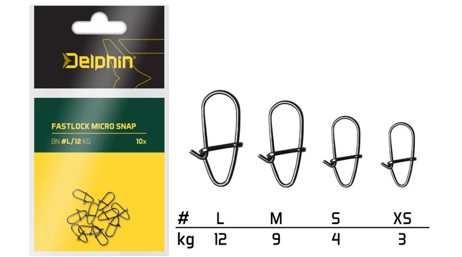 A Delphin FASTLOCK MICRO SNAP karabinert főleg az "Ultralight" pergetőhorgászok fogják kedvelni. Ez a karabiner típus nagyon könnyű, nem terheli a csalit a csalivezetésnél. Ezenfelül nagyon könnyen lekapcsolható, ami a gyors csalicserét segíti. A négy méretnek és terhelhetőségnek köszönhetően minden pergetőhorgász megtalálja a neki megfelelőt.