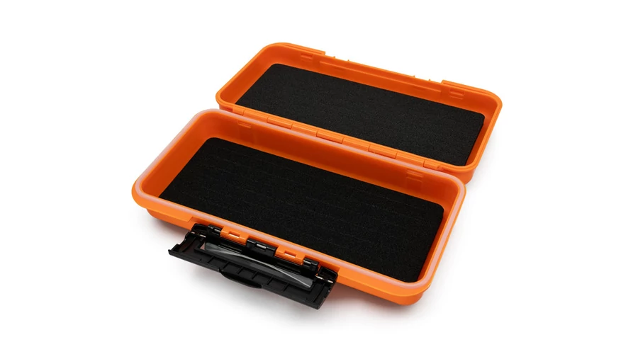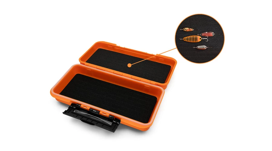 A LureBOX QUICK egy kompakt vízálló doboz pergető műcsalik tárolására. A belseje EVA hab bélést tartalmaz. A habban bevágások találhatók, amelyek segítségével könnyen rögzíthetők benne a jighorgokkal ellátott plasztikcsalik. Egyszerűen nyomja bele a horgot a bevágásba, a csali sértetlen marad, és a hab megvédi a horogok élét az eltompulástól. A doboz TWISTO rendszerek tárolóhelyeként is használható anélkül, hogy azok összegabalyodnának. Különálló horgokat is tárolhat benne, hogy mindig kéznél legyenek, amikor szükség van rájuk. Narancssárga, átláthatatlan műanyagból készül, hogy csökkentse a korrózió kockázatát, amikor használt kellékeket helyez vissza a dobozba. Ezenkívül praktikus műanyag kapcsok vannak a külső oldalán, és tömítéssel van ellátva a nedvesség taszítása érdekében.