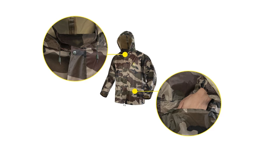 Esős napokra itt a vízálló Delphin PROOF esőruha, amely tökéletesen megvédi viselőjét a rossz időjárástól és meg fogja lepni kompakt szállítási méreteivel. Vízálló, gumírozott anyagból készül, ragasztott varrással és terepmintával.