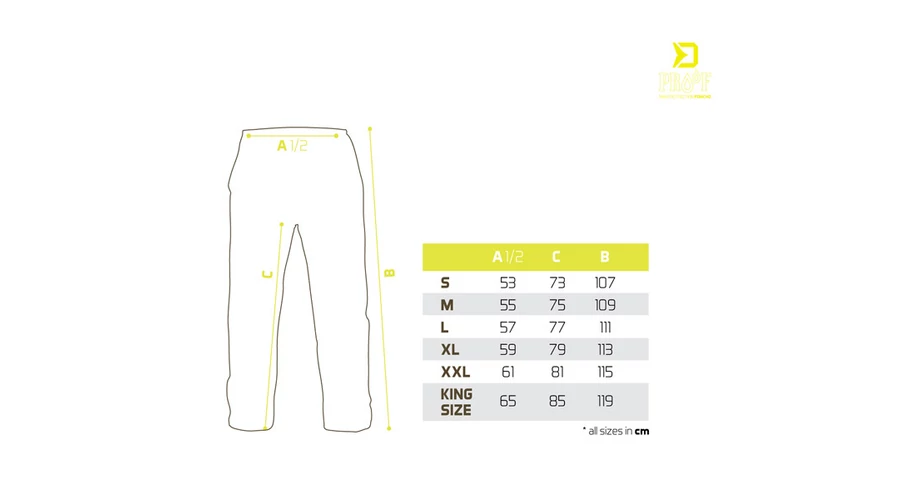 Elasztikus derékpánttal rendelkeznek, így szükség esetén gyorsan felvehető. A nadrág általános szabása bő, így téli ruházat felett is hordható. A szárrészeken patentok találhatók, így szükség esetén szűkítheti őket.Ez az esőruha egy praktikus, cipzáras táskával kerül forgalomba, amelyben száraz és nedves állapotában is szállítható, így megóvja felszerelése egyéb elemeit a véletlen beázástól.