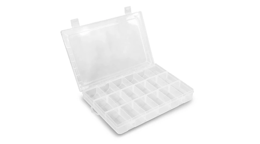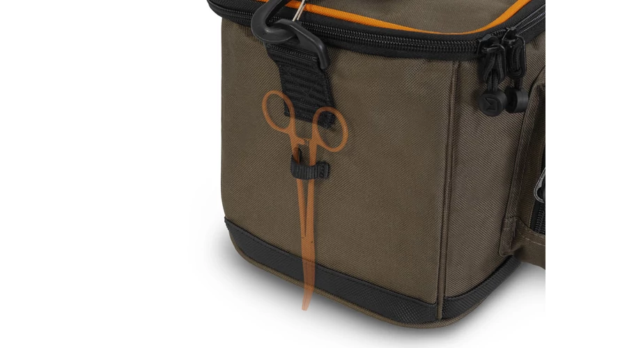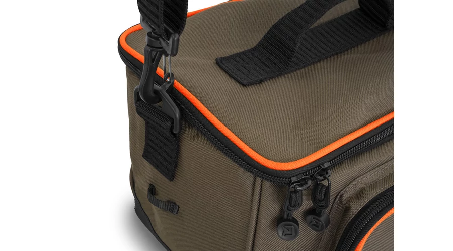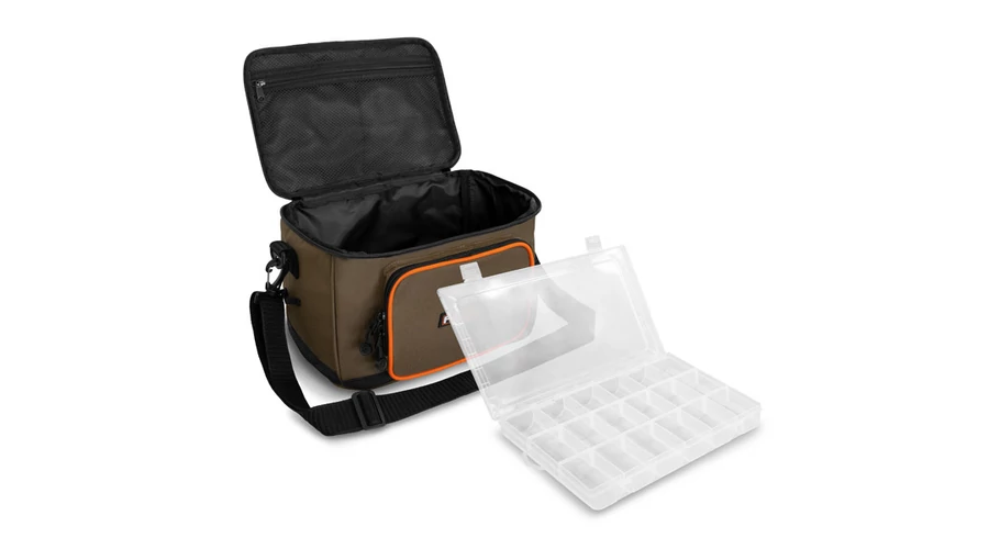 A táska minőségi, tartós anyagokból készül. Ráadásul az alsó részt gumiréteg védi, hogy távol tartsa a talaj nedvességét. A fő tároló részben egy átlátszó műanyag doboz található, állítható rekeszekkel, így mindig tudni fogja, mi van benne. Ez a doboz alkalmas műcsalik, feeder kosarak, vagy egyéb apró kiegészítők tárolására.