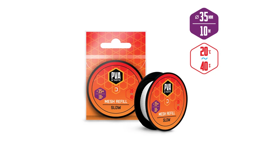 A lassan oldódó PVA tartalék háló ideális a melegebb hónapokban való horgászatra, vagy nagyobb mélységben történő horgászatnál, ahol a szerelék hosszabb ideig süllyed a fenékre. Kiváló minőségű EU-ban gyártott termékről van szó, mely az alapos szövésnek köszönhetően nem okoz önkényes szakadást és a finom szemcsékkel is tökéletesen meg lehet tölteni, így a legvonzóbb összetételű csalit küldheted a vízbe, a csalival együtt közvetlenül a szereléken.