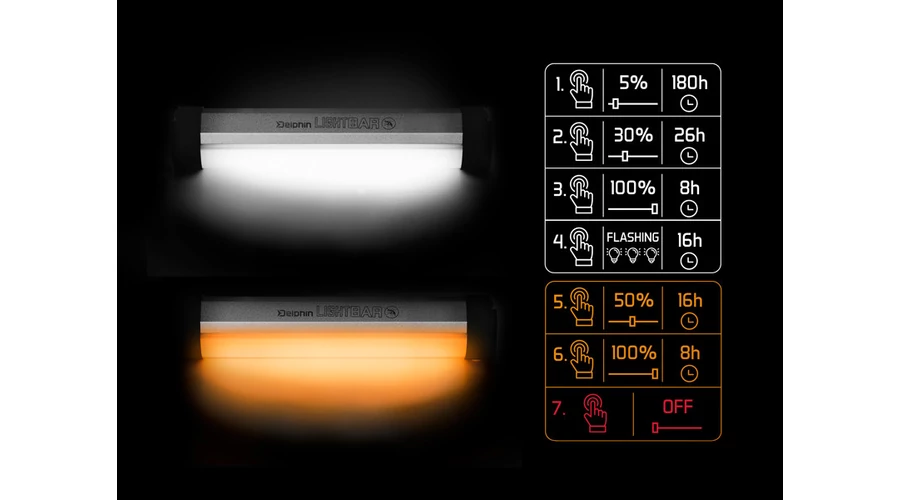 A Delphin LightBAR UC egy nagyon praktikus sátorlámpa, melyle a sötétség nem lepi meg. Két világító színnel rendelkezik, valamint választható a fényerő is. Az első kapcsolás után 5% fényerővel a fehér fény gyullad ki. A második megnyomás után 30%, a harmadik után 100% a fényerő. A negyedik gombnyomás után villogni kezd, melyet behúzásnál fog értékelni amikor visszafele tudja a tábora pontos irányát.
