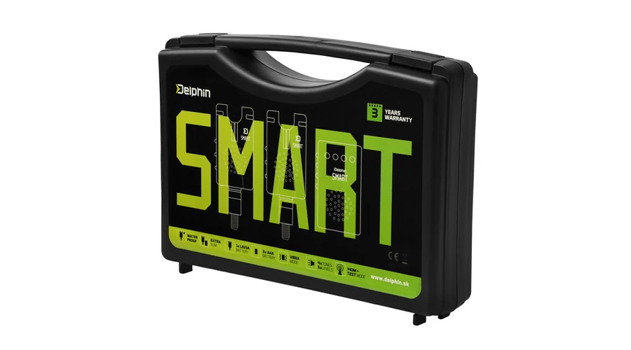 Nem mindennapi kapásjelző szett, mely megkülönbözteti a többi horgásztól. A jellemzője a nagyon karcsú kivitel. A Delphin SMART kompakt méreteivel biztonságosan működő kapásjelző szett mely hang, fény és vibráló jelzést add. A kapásjelző és a vevő is nagyon erős és ellenálló műanyagból készült, ami hozzájárul a hosszú élettartamhoz. A biztonságos szállítás érdekében szállító kofferben kapható.