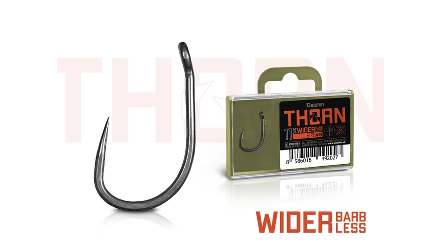 A THORN Wider BarbLESS különleges a már legendás wide gape formájának köszönhetően. Ez egy horog, amelyet szélesebb ív és egyenes szár jellemez. Ezeknek a paramétereknek köszönhetően nagyon univerzális és megbízható horog, amely különféle szerelékekhez és csalikhoz használható. Ebben az esetben a horognak nincs szakálla, ami sokkal könnyebben behatol a ponty szájába.