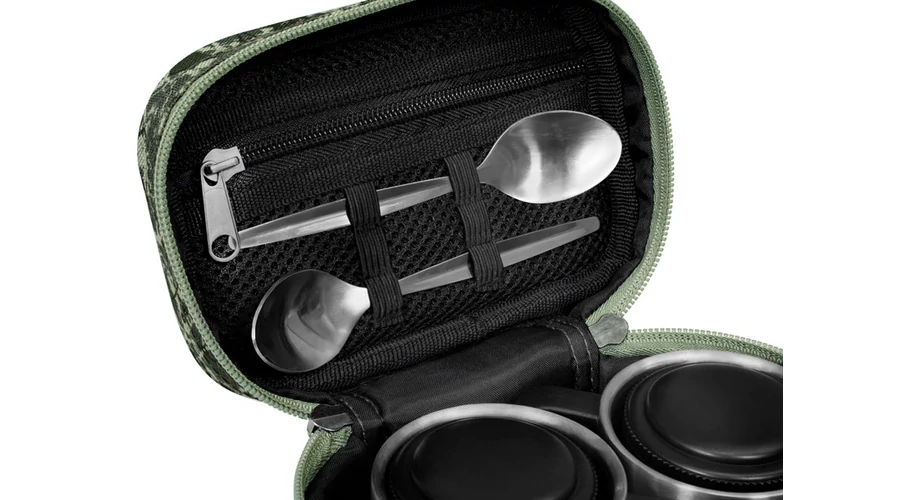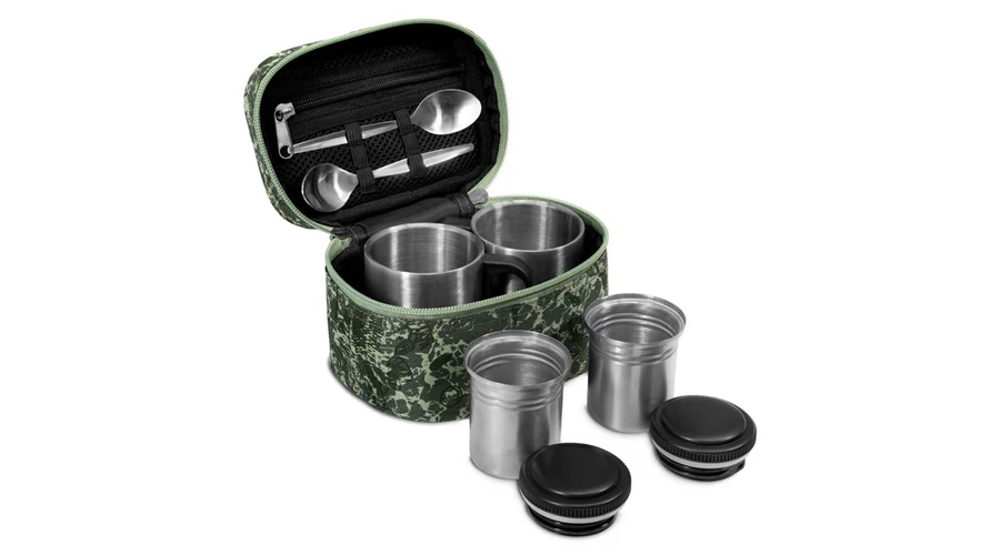 Kis méret, nagy beltartalom – ilyen a Delphin COTEA. Kis szállítási méretű termék, melynek köszönhetően szinte alig foglal némi helyet a felszerelésében. Mindazonáltal olyan készletet rejt, amely mindenkinek örömet okoz, aki szeret egy jó kávét vagy egy forró teát a víz mellett elfogyasztani.A COTEA két kiváló minőségű rozsdamentes acél csészét, két teáskanalat és két zárható rozsdamentes acél edényt is tartalmaz, amelyek például cukor vagy kávé tárolására is használhatók. Magának a táskának van egy kis hálós zsebe, amelybe könnyedén elfér elegendő mennyiségű teafilter. Ezenkívül minőségi cipzárral, a külsőrész pedig egy Delphin logóval ellátott praktikus fogantyúval van felszerelve. A COTEA egyedi C2G terepszínben készült, hatásos piktogrammal, amely meghatározza ennek a különleges terméknek a használatát.