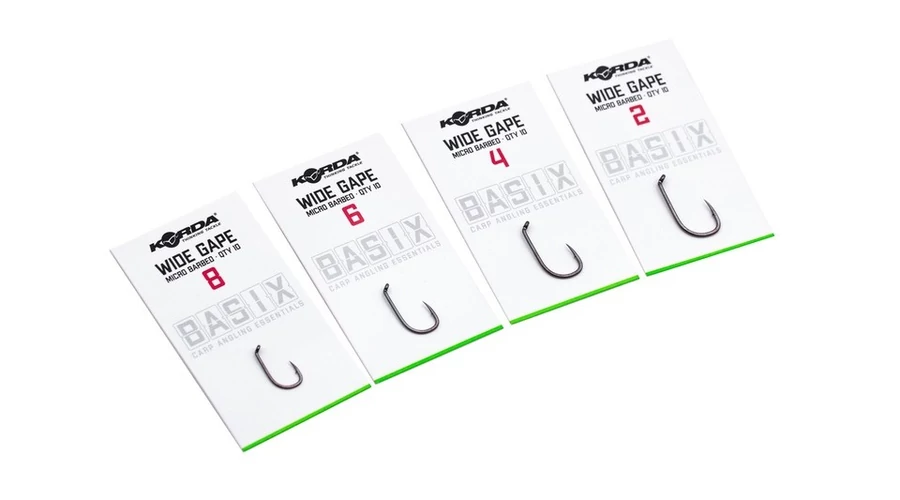 A Korda BASIX Wide Gape Hooks Micro Barbed Size 2/4/6/8 - mikro szakállas Wide Gape horgok 2, 4, 6 8-as méretekben, a horgot úgy tervezték, hogy tökéletes kör alakú formája legyen, amelyet egyenesen a csomagból lehet felhasználni a legkülönfélébb szerelékekhez, anélkül, hogy sok más alkatrészt kellene hozzáadni - akár süllyedő csalinak, akár pop-up és wafter-hez is használható. Az agresszív befordított fül segít abban, hogy beforduljon és jól akadjon anélkül, hogy további Kickers-t vagy zsugorcsövet kellene hozzáadni.