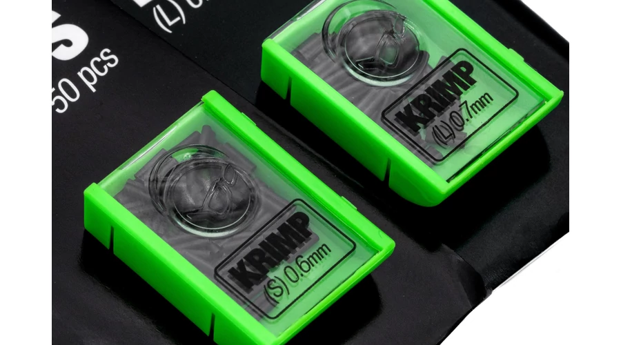 A krimpelés egy nagyszerű módja egy erős, strapabíró szerelék létrehozásának, különösen akkor, ha merevebb és/vagy vastagabb anyagokat használ, amelyeket nehéz hatékonyan csomózni – ráadásul lehetővé teszi, hogy minden alkalommal megfelelő horoghosszúságot állítson be, ami különösen hasznos például chod szerelékeknél. Ezeket a hüvelyeket úgy tervezték, hogy különféle horogelőkékkel használhatók legyenek és a Krimp Tool-unkkal együtt használva olyan kapcsolatot biztosítanak, amelyben minden alkalommal bízhat. Gondoskodnia kell arról, hogy megfelelő méretű Krimp-et használjon a választott horogelőkéhez – ha a hüvely túl nagy, akkor elcsúszhat –, a Small 0,6 mm-es változat pedig tökéletes olyan anyagokhoz való használatra, mint a Mouth Trap, a Boom 25lb változata, vagy akár merev bevonatú fonatokhoz, mint például a Hyrbid. A nagy, 0,7 mm-es Krimp nagyon vastag anyagokhoz való, mint például a 35 lb Boom vagy a nagyon vastag mono zsinórhoz. A termékcsalád legújabb tagja, az X-Small 0,5 mm-es változata tökéletes a 15 lb-s Boom-hoz vagy bármilyen más horogelőkéhez, amely alkalmas krimpelésre (nagyon alacsony nyúlással, vagy nyúlás mentes legyen) 0,40mm és 0,50 mm közötti átmérő. Egy kis műanyag csúszó fedéllel rendelkező dobozban érkeznek, ami segít megelőzni a kiszóródást.