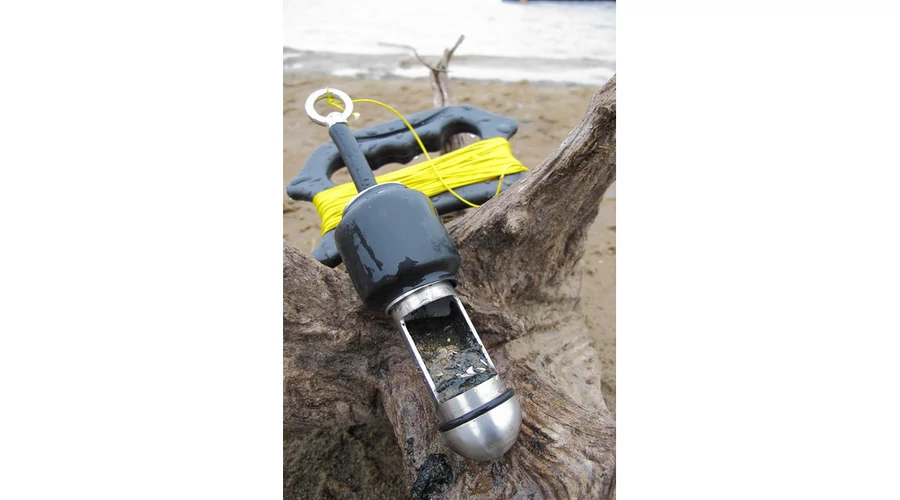 Fenékmedert kétféle képpen tudjuk vizsgálni ezzel az eszközzel. Simán a súlyánál fogva letapogatjuk a feneket vagy ami még fontosabb mintát veszünk a becsapódás helyén a fenékból. Legyen az iszap, homok, sóder vagy márgás mederfenék. Kézzel fogható mintát tudunk venni a meghorgászandó területről ami sok hasznos információvakl lát el minket. pl van -e szunyoglárva, mennyire büdös az iszap stb. A minta vevőt csónakos letapogatásra fejlesztették de partról is 15 méterig használható. A szerkezet súlya 560gr és roszdamentes inoxból készült. Külön akasztható kézi foggantyút és 15 méter zsinórt kapott a kényelmes kezelhetőség miatt.