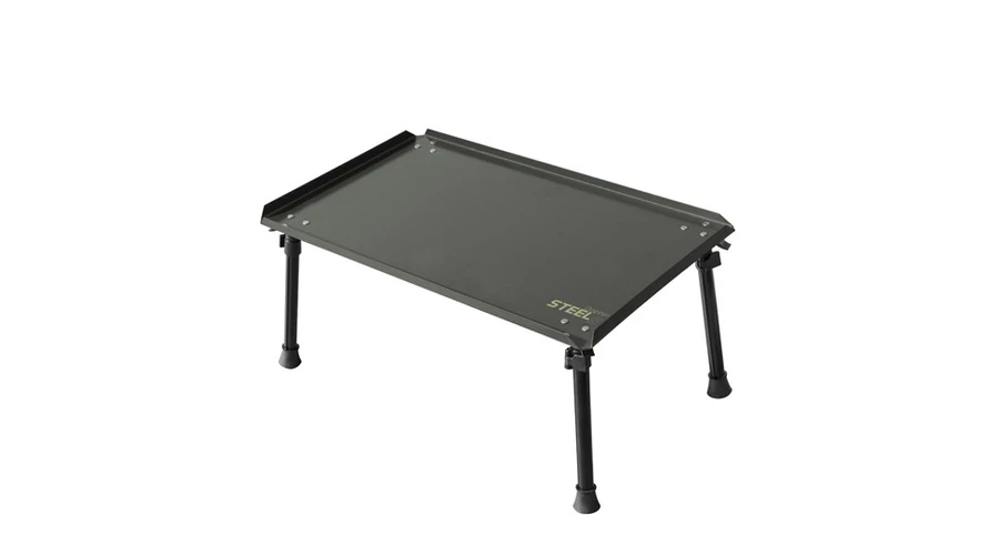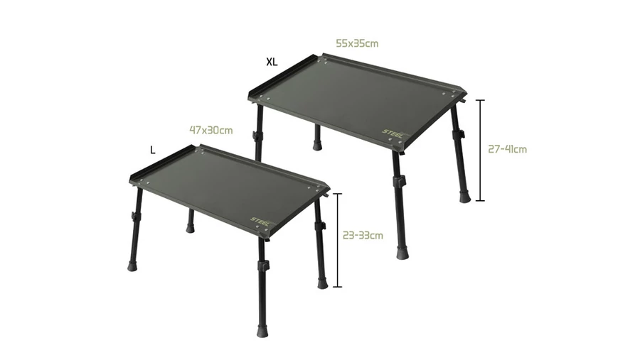 A tartós és praktikus STEELS asztal használható előke kötéshez, valamint reggeli kávéhoz a sátorban vagy az esti grillezéshez. Az asztal fém munkalap 47x30 cm (L változat) vagy 55x35cm (XL változat). Az asztal sarkai nyitva vannak a jobb vízelvezetéshez, ha az asztalt véletlenül a sátor előtt felejti az esőben. A STEELS robusztus teleszkópos lábakkal rendelkezik. Az asztal állítható magassága 23-33 cm (L változat) vagy 27-41 cm (XL változat). A lábak egy speciális mechanizmussal zárhatók, hogy megakadályozzák a nem kívánt összeomlását. A lábak gumírozottak. Az asztalhoz hordtáska tartozik.